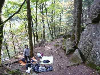 空はどんより、晴れ予報はどこへやら・・・。 今日は私の希望で、中里の天狗岩。 今にも降り出しそうな空を心配しつつ登り始めた。 うっちゃり(5.11a)が今日の目標。 今日もトップロープトライ。 1回目は途中で疲れてしまって降りてきた。 2回目でムーブ解決。 3回目でノーテンション。 ・・・去年はかなり厳しく感じたのだが、進歩したのかな? ダンナは一番状態が良さそうな(それでも出だしびしょびしょ)のカチの特訓 5.13aを2撃でした。 岩場は杉林の中で薄暗いし、風が吹きぬける。 まだ耐えらえないような寒さではないが、2人だけだと心が寒い。 寂しかった・・・。 とりあえず雨は降らなかったので、よしとしよう 岩場で15分走(移動?同じところをぐるぐる、登ったり降りたり)した。 帰りは『ヴィラせせらぎ』の露天風呂で長風呂 気持ちよかった~